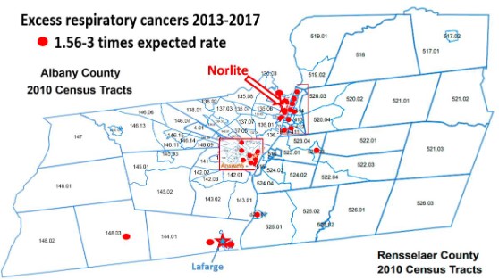 In Albany County, upstate New York, residents organized under the moniker Lights Out Norlite have been fighting to protect themselves from polluting air emissions released by the Norlite aggregate production facility. Norlite’s industrial operation burns hazardous waste and releases crystalline silica and dangerous levels of particulate matter. Inhalation of crystalline silica can cause irreversible lung damage, and can lead to lung disease, COPD, kidney disease, autoimmune disorders, cardiovascular impairment, and lung cancer. Exposure to small particulate matter of this kind can cause severe adverse health consequences, including cardiac disorders, exacerbating asthma, causing bronchitis, cerebrovascular incidents, increased risk of diabetes, and increased rate of mortality for those exposed.
